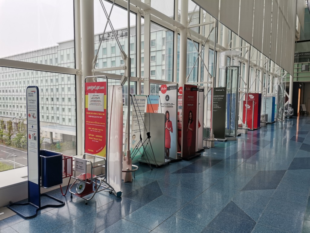 各航空会社の立て看板が集結しています。