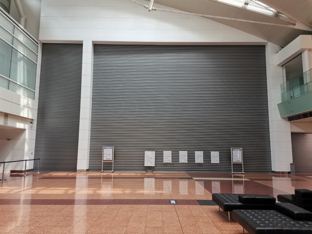 新設した国際線エリアは運用を停止しているため、シャッターを下ろしています。
