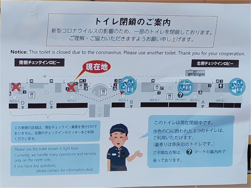 おそらく、正確に表現すると「新型コロナウィルスによる影響でターミナル利用客が減少し、トイレの利用頻度が極端に少なくなりました。このため清掃費用や水道光熱費といった管理コスト削減のため、このトイレを閉鎖します」といったところでしょうか。