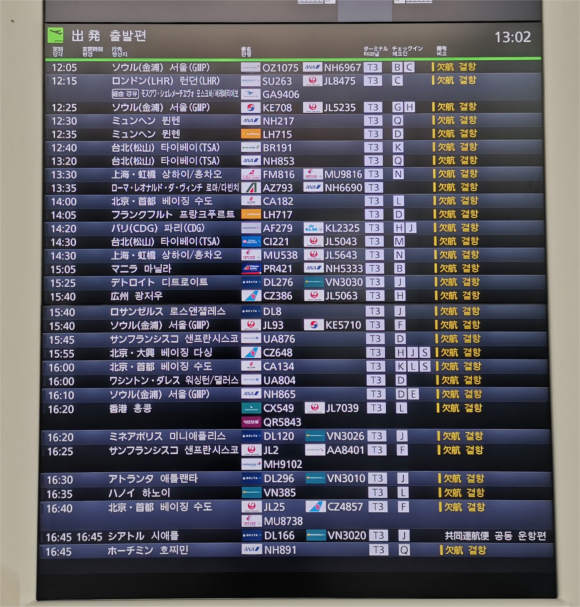 16:45発のシアトル行きのデルタ航空しか出発便がありません。