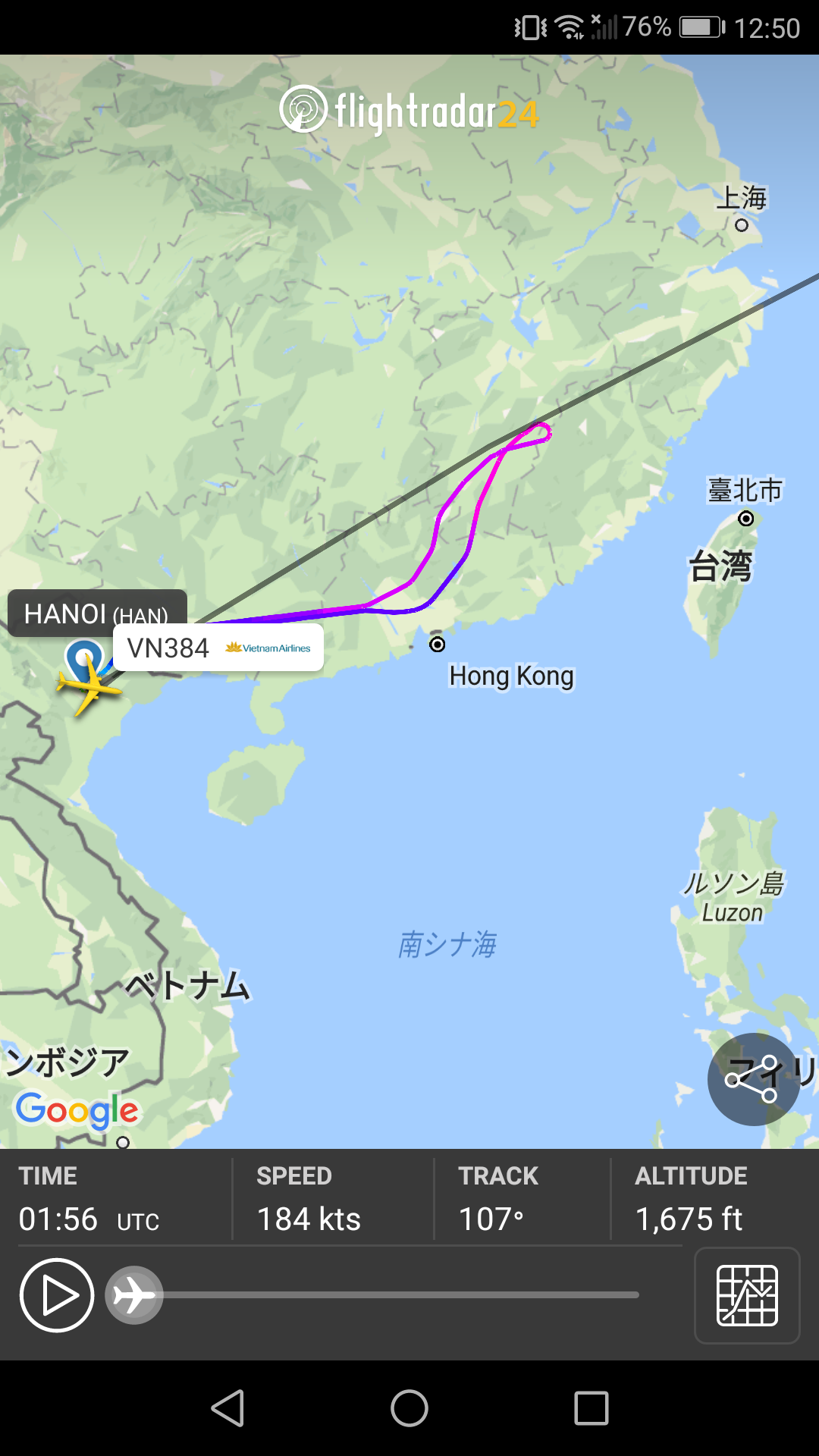 飛行機は、現在香港と上海の中間あたり。