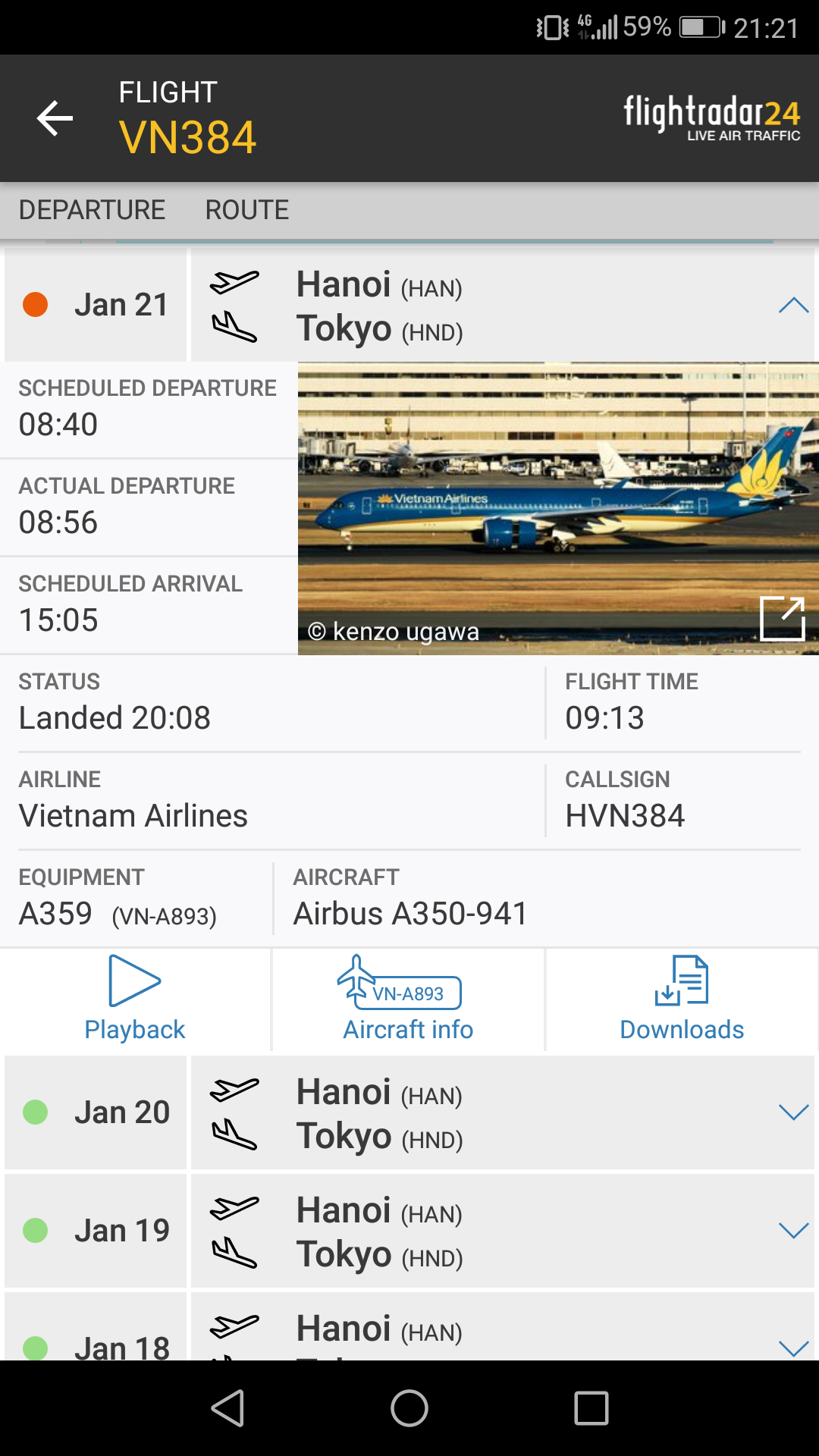 2018年1月21日、現地時間8時40分ハノイ・ノイバイ空港発のベトナム航空(VN384便)羽田空港行き。