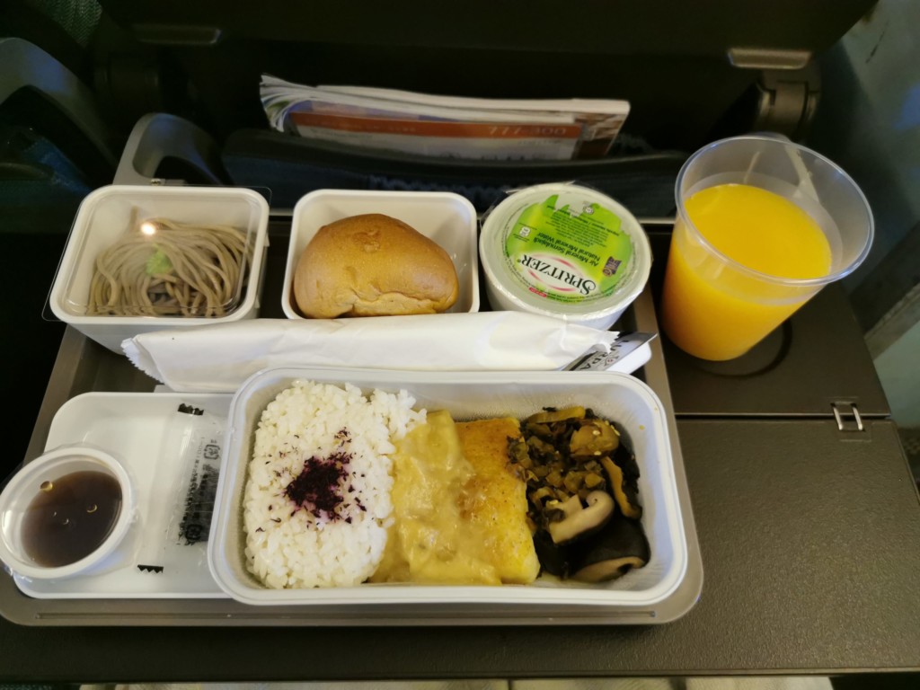 機内食は日本食が売り切れ、選択の余地なく洋食。