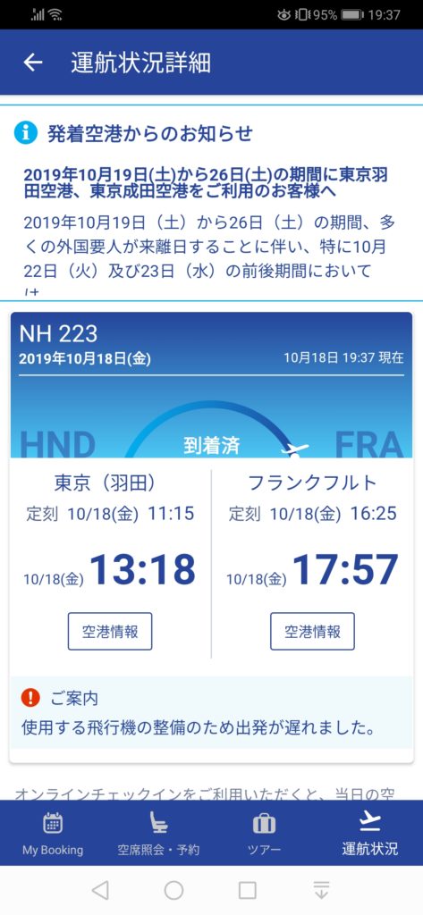 結局、羽田→フランクフルト、フランクフルト→チューリッヒの両方のフライトで大幅遅延です。