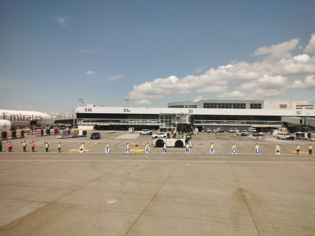 なんと、ANAの地上スタッフが一列になってお見送りをしています。