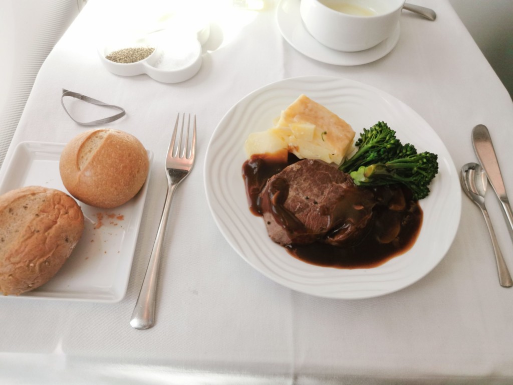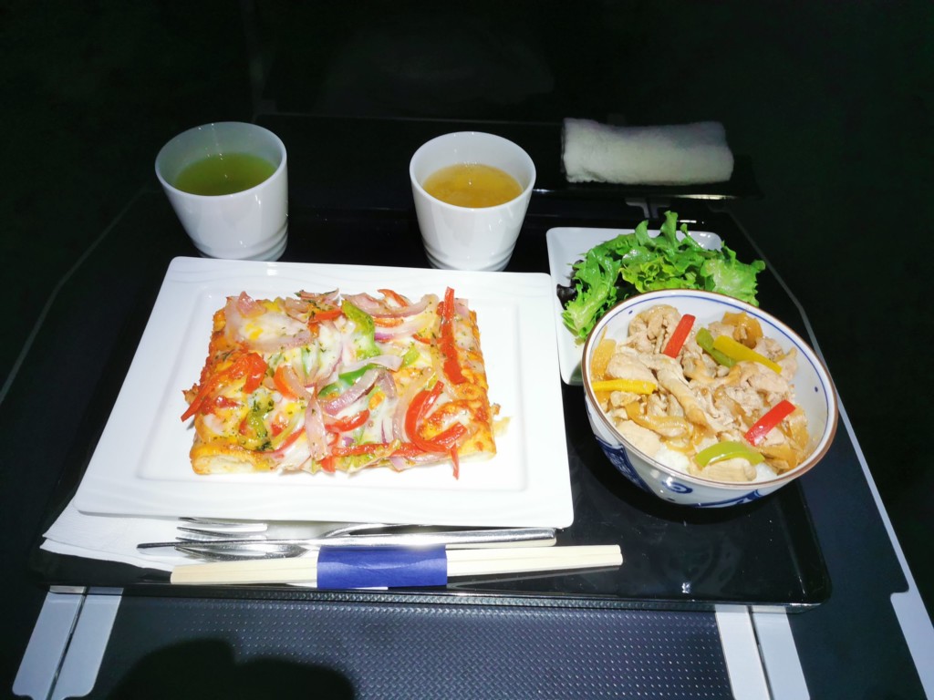 十分高度が上がった所で、シートベルト着用のサインが消え、機内食の時間です。