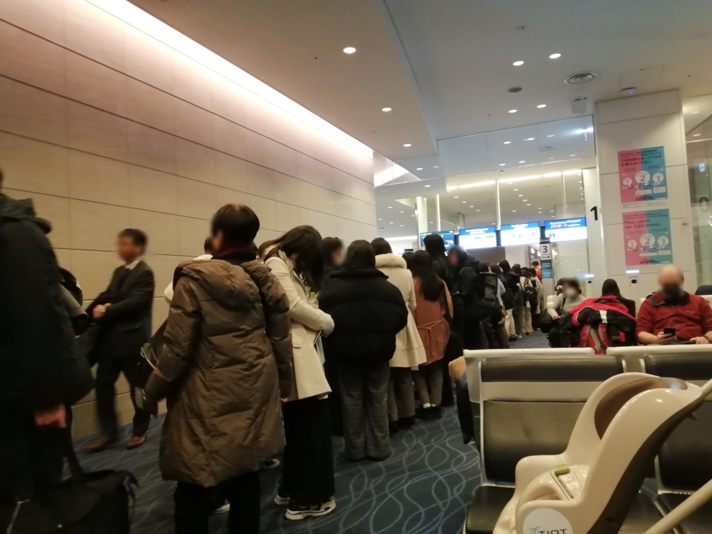 搭乗時間が近づいてきましたが、エコノミークラスのレーンは修学旅行団体客で長蛇の列です。