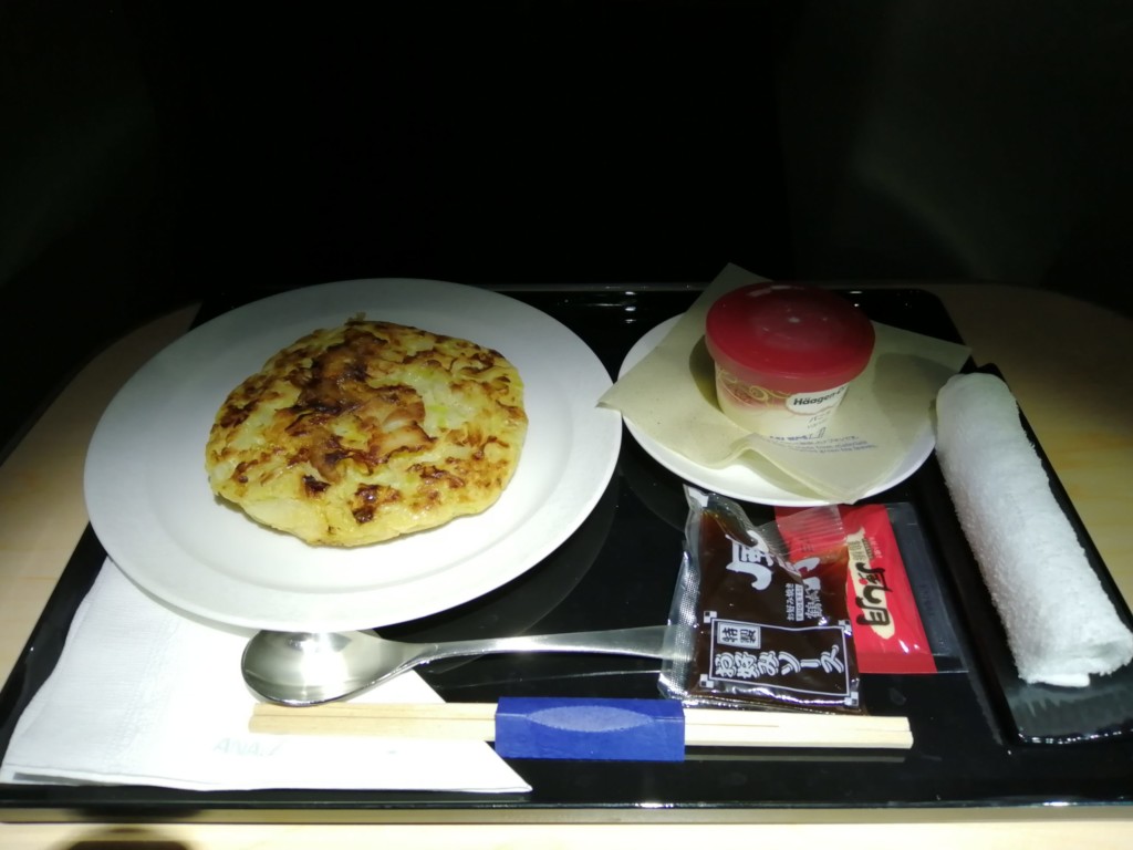 ちなみに、以前、ANAファーストクラスに搭乗した時に、ビジネスクラスの軽食メニューにあった、お好み焼きを注文した時に出てきたのは下記の写真です。