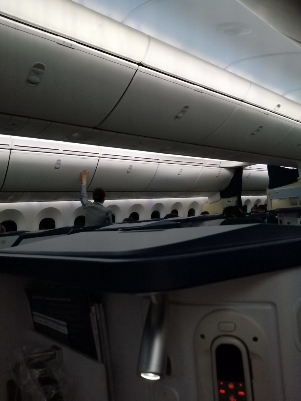 (一応、照明を全開にしても回りの席に光の影響がないか、座席の後ろの通路から確認します。