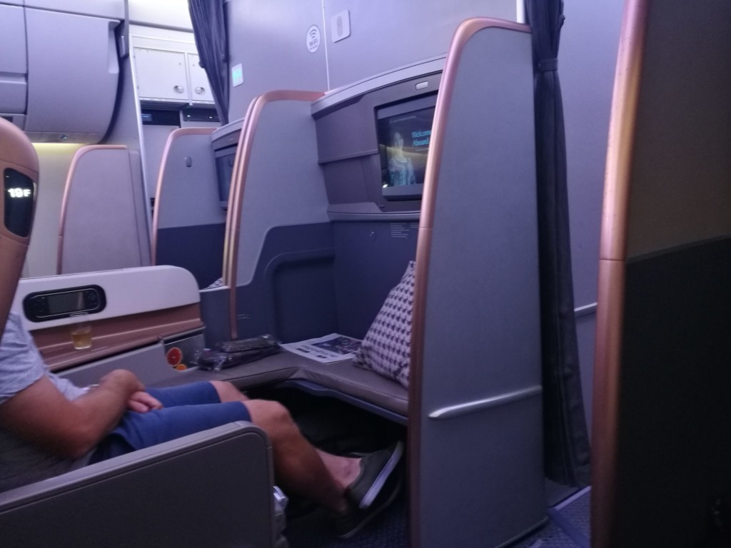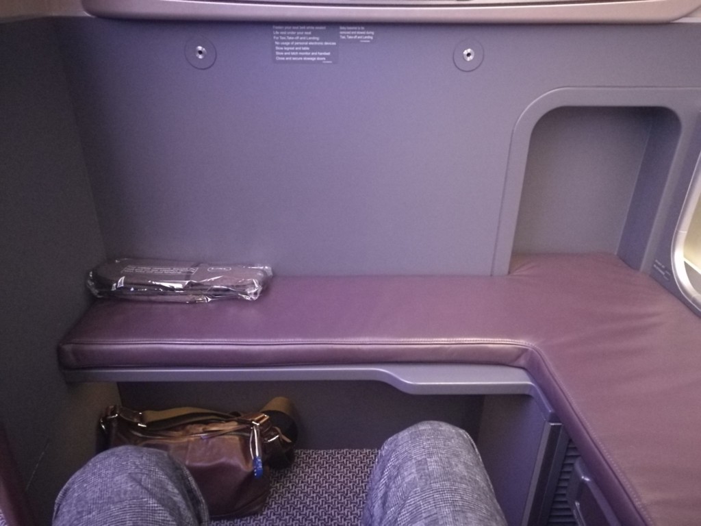シンガポール航空のビジネスクラスのバルクヘッド席は、正面を向いた状態で足を延ばす事ができるので、かなりおススメです。