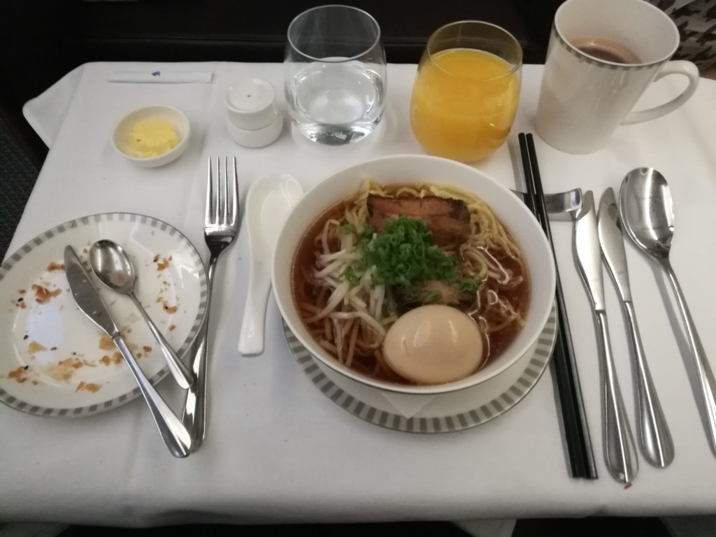 ラーメンを食べ終わり、食器を下げてもらった際に、夕食・朝食共に「ブック・ザ・クック」で日本食を頼んだのが珍しいのか、CAさんも若干苦笑いです(笑)