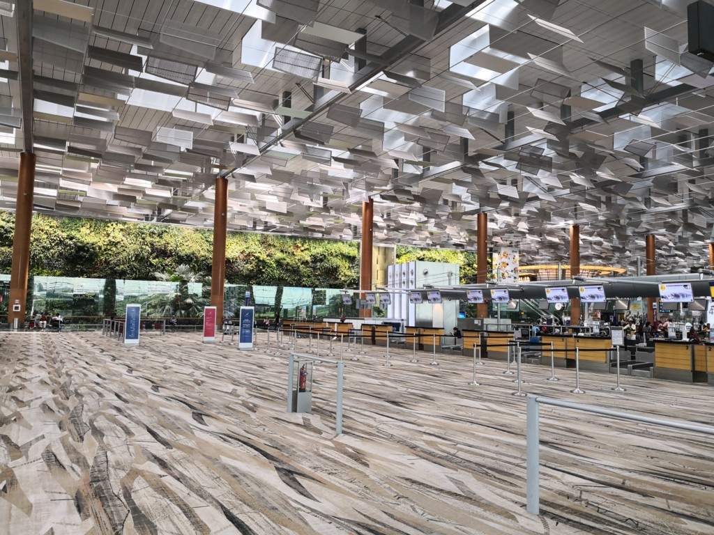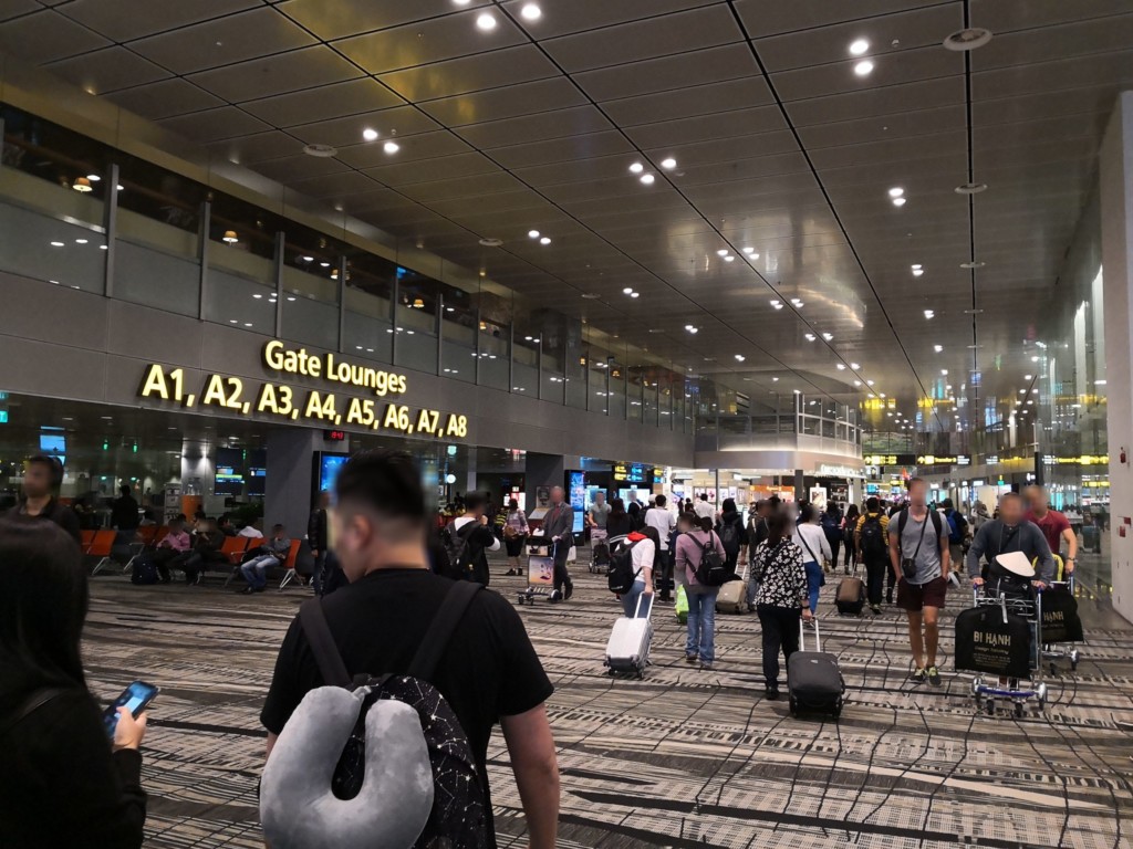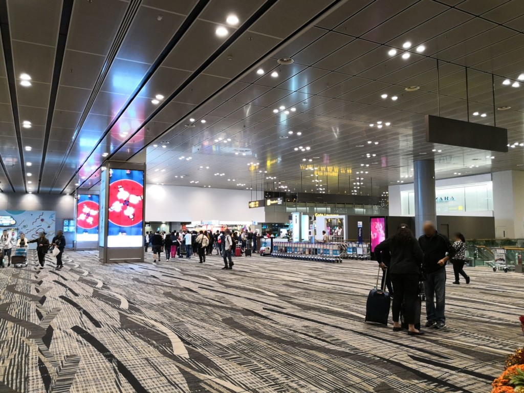 チャンギ空港はターミナル2ですと、搭乗ゲート毎にセキュリティチェックがありますが、ターミナル3はゲートラウンジ方式を基本採用しており、複数の搭乗ゲートをまとめて1区画として、その区画に入る前にセキュリティチェックを行います。