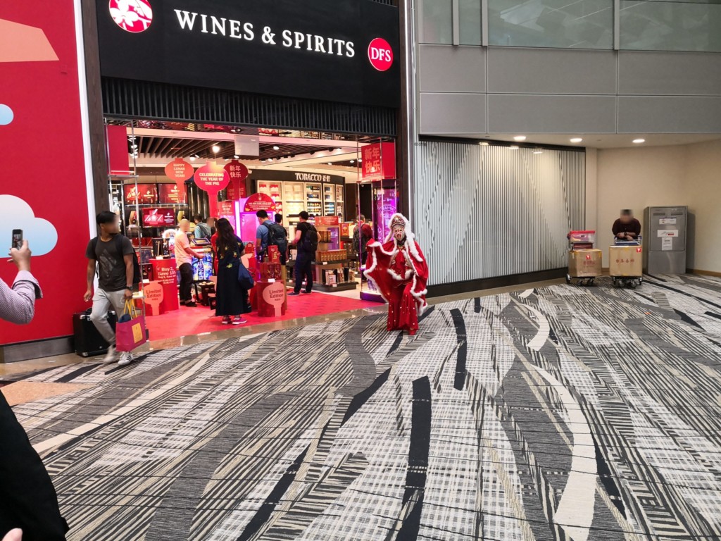 免税店の前で、旧正月をお祝いしていると思われる踊りを踊っています。