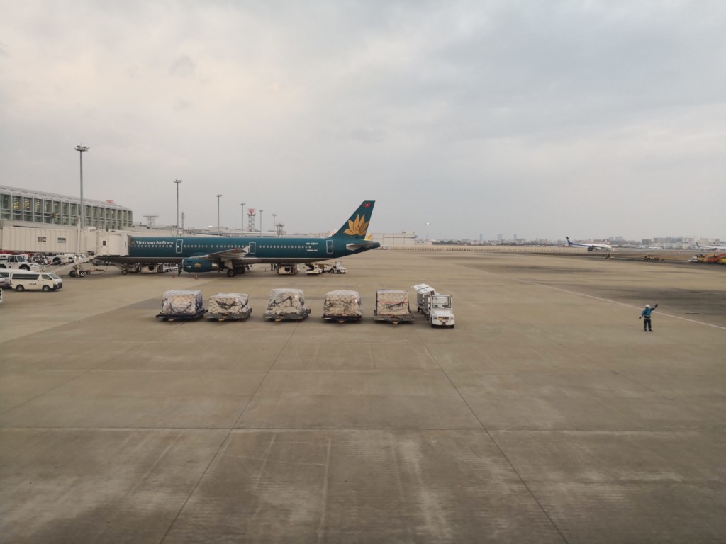 無事に着陸し、ベトナム航空の横の到着ゲートで機体が停止します。