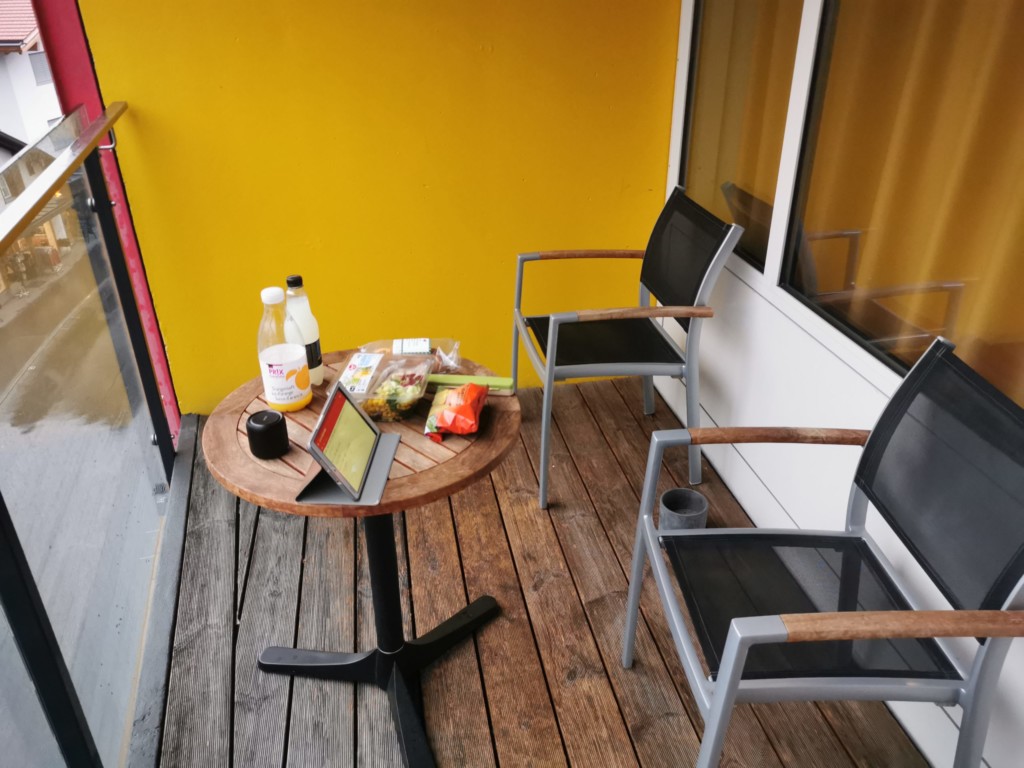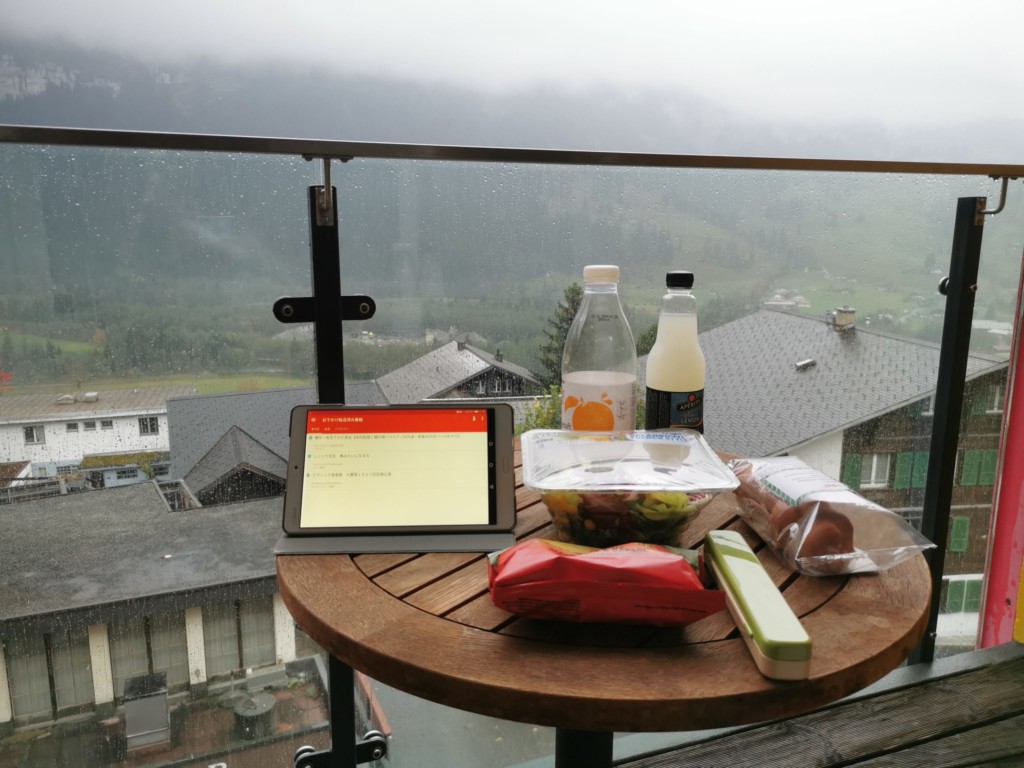 こんな感じて近所のスーパーで食料を買ってきて、ベランダに座ってアイガーを眺めながら夕食を頂きます。
