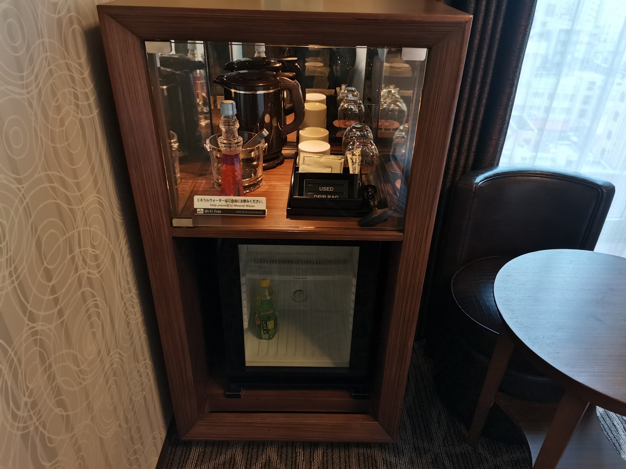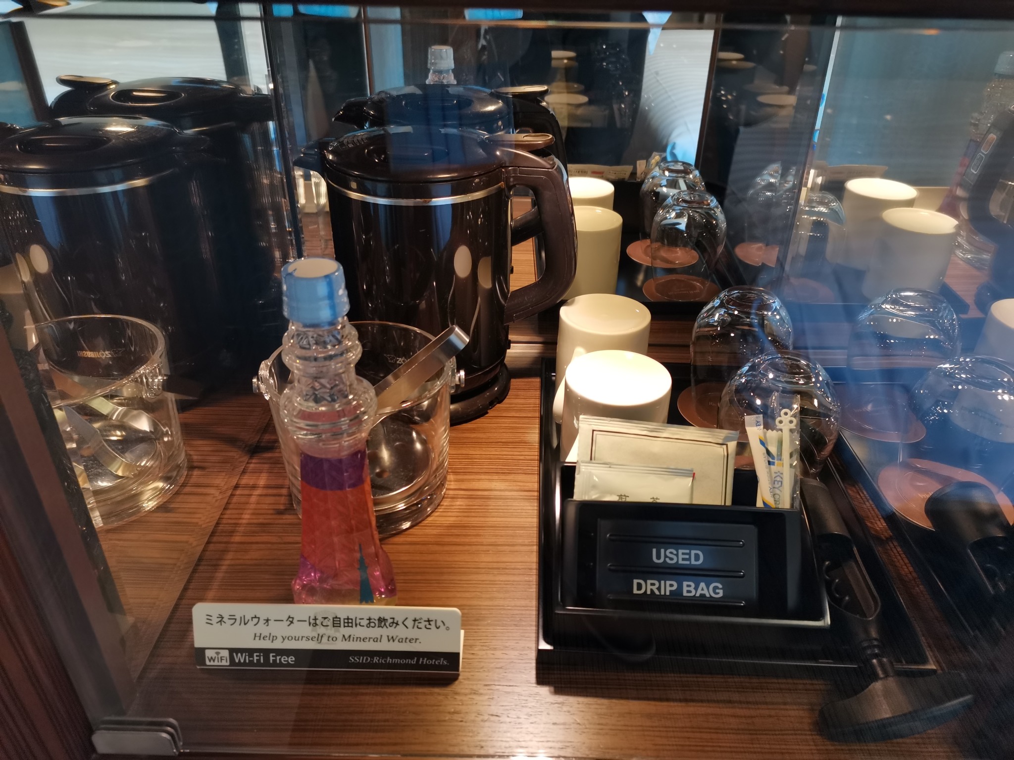 上段は電気ケトル、グラス、無料のお茶とコーヒーと水(RO膜処理水)です。