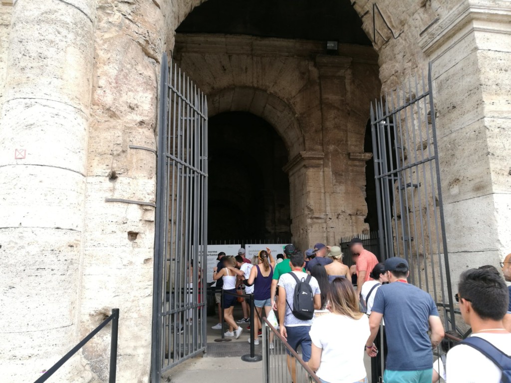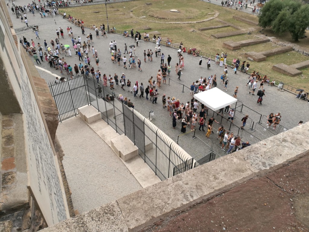 奥に白いテントが見えますが、実際の行列はテントの先のコロッセオ入り口から続いています。