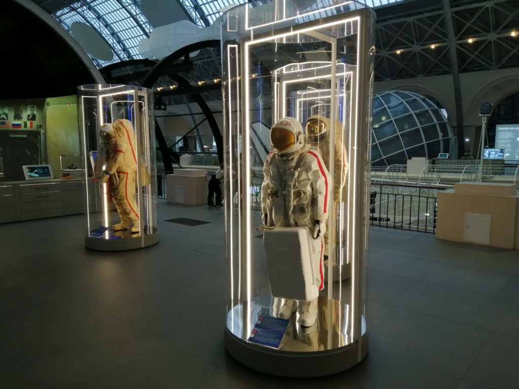 昔の宇宙服(手前側)は、現在の宇宙服(奥側)と比べると、ずいぶんと薄いことが分かります。