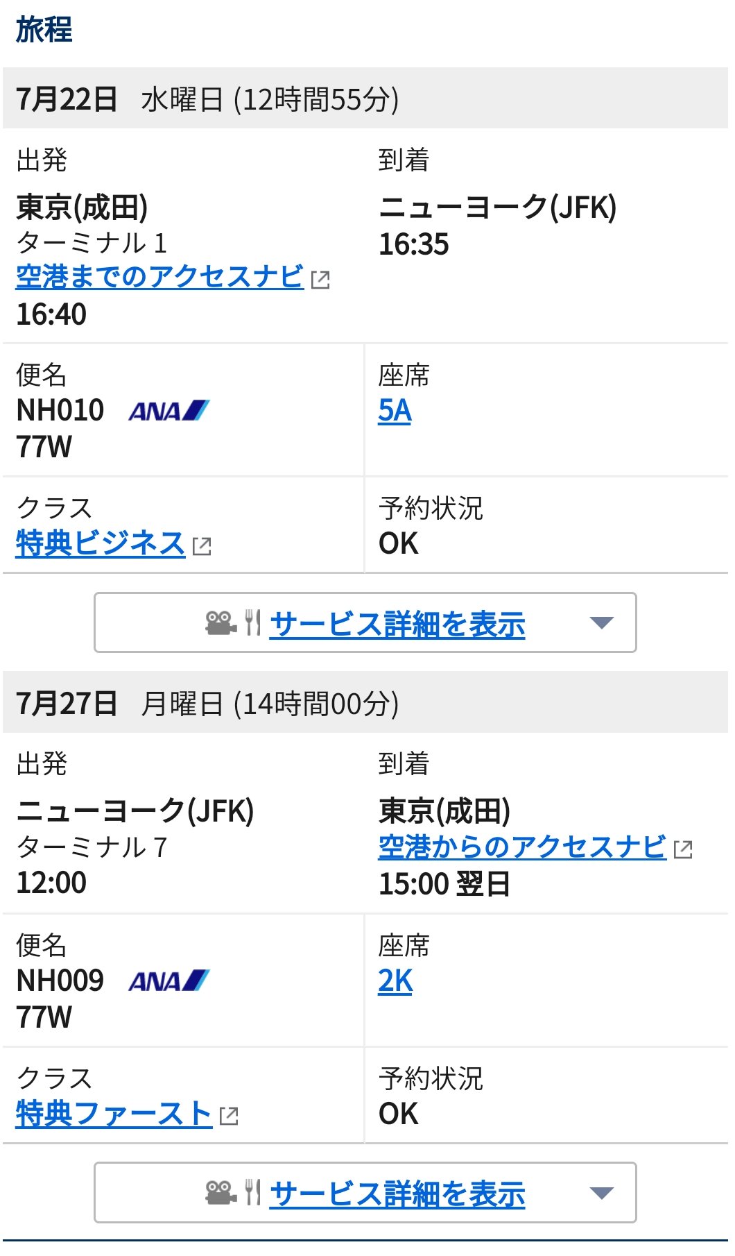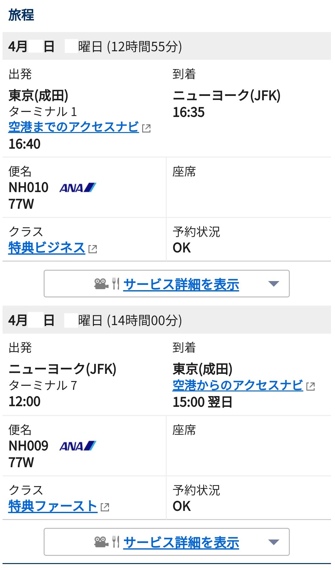航空券は、ANAは特典航空券で、行きはビジネスクラスで帰りはファーストクラス。