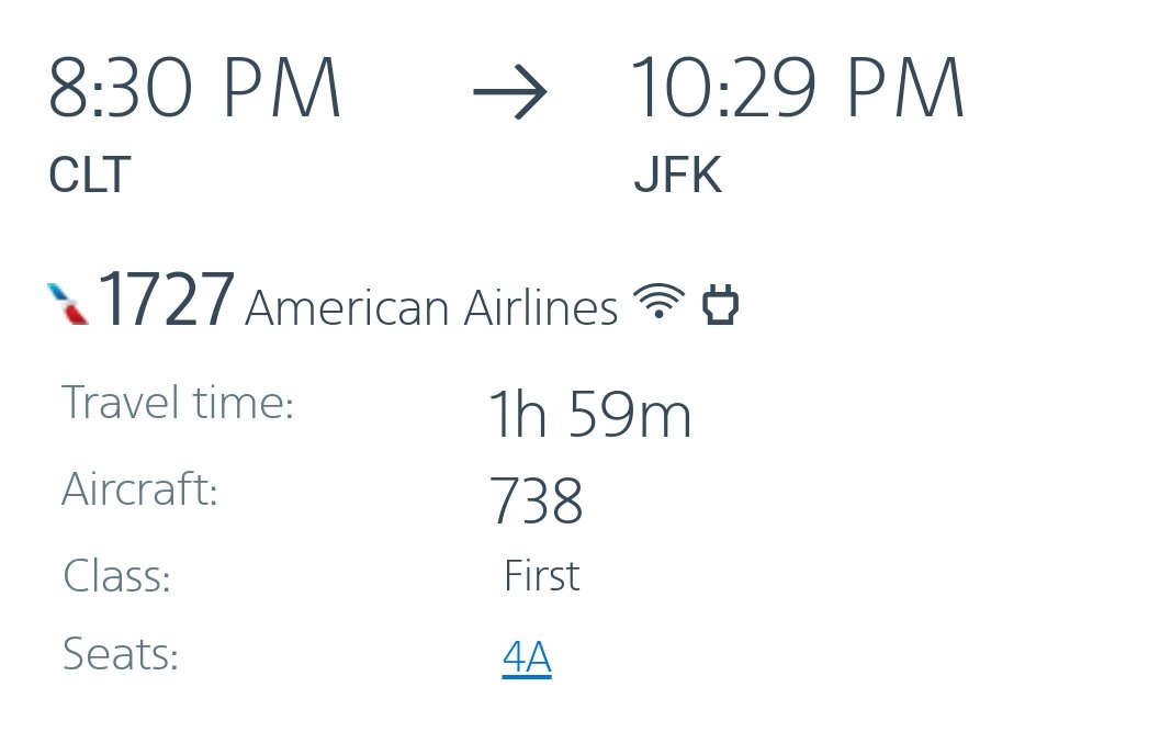 5:00 (ニューヨーク) → 6:53 (シャーロット) アメリカン航空1724便